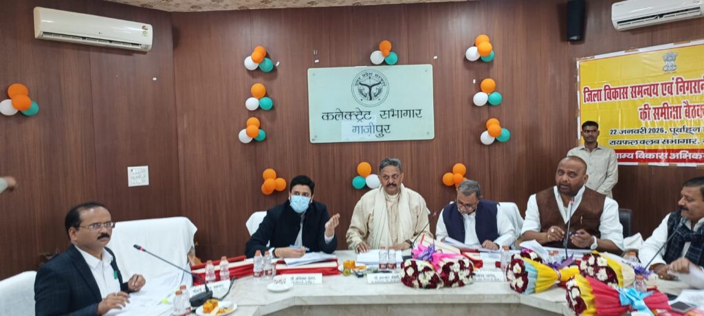गाजीपुर । जिला विकास समन्वय एवं निगरानी समिति (दिशा) की बैठक कलेक्ट्रेट सभागार में गुरुवार को हुई। बैठक सांसद अफजाल अंसारी की अध्यक्षता एवं सांसद बलिया सनातन पाण्डेय, विधायक जमानियां ओम प्रकाश सिंह, विधायक मुहम्मदाबाद सुहेब उर्फ मन्नू अंसारी, विधायक सदर जयकिशुन शाहू, विधायक जखनियां बेदीराम, विधायक जंगीपुर डा0 विरेन्द्र यादव, नगर पालिका अध्यक्ष सरिता अग्रवाल, प्रतिनिधि विधायक जहूराबाद, जिलाधिकारी अविनाश कुमार, ब्लाक प्रमुखों, नामित सदस्य/प्रधानगण की उपस्थित रहे। बैठक में सांसद द्वय द्वारा सदन की कार्यवाही प्रारम्भ की गयी। बैठक में जिलाधिकारी अविनाश कुमार ने बैठक का एजेण्डा बिन्दु विस्तारपूर्वक समिति के सम्मुख पी पी टी के माध्यम से प्रस्तुत किया ।