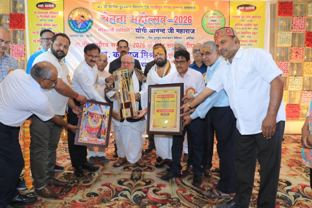 गाजीपुर ।साहित्य चेतना समाज का 41वाँ वार्षिक पुरस्कार वितरण एवं ‘गाजीपुर गौरव सम्मान’ समारोह (चेतना महोत्सव-2026) नगर के स्थित शहनाई पैलेस में सम्पन्न हुआ।योगी आनन्द की गरिमामयी उपस्थिति में सम्पन्न इस समारोह की अध्यक्षता पूर्व कुलपति प्रो.राममोहन पाठक ने की समारोह का शुभारंभ माँ सरस्वती की प्रतिमा के समक्ष दीप प्रज्ज्वलन व पुष्पार्चन से हुआ।संस्था के संस्थापक अमरनाथ तिवारी ‘अमर’ ने संस्था के उद्देश्य एवं गतिविधियों पर विस्तार से प्रकाश डाला। समारोह में जनपद के सैदपुर तहसील के मलिकपुर गाँव के निवासी पूर्व राज्यपाल कलराज मिश्र को ‘गाजीपुर गौरव सम्मान’ से सम्मानित किया गया।उन्हें जब अंगवस्त्रम्,स्मृति-चिह्न व सम्मान पत्र प्रदान कियागया।सम्मान पत्र का वाचन संस्था के संगठन सचिव प्रभाकर त्रिपाठी ने किया।अपने उद्बोधन में कलराज मिश्र ने कहा कि गाजीपुर साहित्यिक-सांस्कृतिक एवं बौद्धिक रूप से अत्यंत समृद्ध रहा है।यह ॠषियों,तपस्वियों की भूमि रही है।शौर्य व पराक्रम में भी यहाँ के लोगों ने अपना लोहा मनवाया है।यहाँ के लोगों ने पूरे विश्व में अपना परचम फहराया है।गाजीपुर की इसी पवित्र मिट्टी ने भी मुझे भी गढ़ा है,संस्कारित किया है।गाजीपुर मेरे हृदय में बसता है।मैं गाजीपुर में जन्मा हूँ,मुझे इस पर गर्व है।मैं साहित्य चेतना समाज के प्रति आभार व्यक्त करता हूँ कि उन्होंने मुझे इसके लिए चुना।