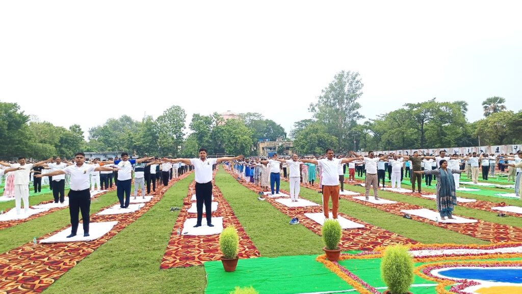 21 जून 2025 अन्तर्राष्ट्रीय योग दिवस यह एक ऐसा मौका था, जब जनप्रतिनिधि, जिले भर के अधिकारी और आम नागरिकों ने एक साथ योगाभ्यास किया। इसमें जनपद के कुशल योग प्रशिक्षक प्रतीक्षा पाण्डेय एवं धीरज राय ने कॉमन योग प्रोटोकॉल की ग्रीवा शक्ति, शक्ति एवं घुटना शक्ति विकासक क्रियाओं, ताड़ासन, वृक्षासन, पादहस्तासन, अर्ध चक्रासन, भद्रासन, वज्रासन, उष्ट्रासन, उत्तान मंडूकासन, मकरासन, भुजंगासन, शलभासन, सेतुबंधासन, उत्तानपादासन, अर्ध हलासन, पवनमुक्तासन एवं सवासन सहित कपालभाति नाड़ी शोधन प्राणायाम शीतली प्राणायाम भ्रामरी प्राणायाम और ध्यान का अभ्यास कराते हुए प्रतिदिन योगाभ्यास का संकल्प दिलाया। साथ ही इन योगासनों के शरीर पर पड़ने वाले प्रभावों और निरोगीकाया के लिए इनके महत्व को बताया। कार्यक्रम मे मुख्य अतिथि, विशिष्ट अतिथि एवं उपस्थित आगन्तुकों का आभार मुख्य विकास अधिकारी संतोष कुमार वैश्य ने व्यक्त किया। संचालन सुभाष चन्द्र प्रसाद लेखा एवं कार्यक्रम सहायक नेहरू युवा केन्द्र ने किया।