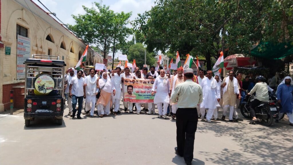 गाजीपुर।उत्तर प्रदेश में सरकारी विद्यालयों को बंद करने की नीति के विरोध में कांग्रेस पार्टी ने शनिवार को सरजू पांडे पार्क, कचहरी पर धरना-प्रदर्शन किया। इस विरोध प्रदर्शन का नेतृत्व कांग्रेस जिलाध्यक्ष सुनील राम ने किया। कार्यक्रम में कांग्रेस के जिला, शहर, ब्लॉक और फ्रंटल संगठनों के तमाम कार्यकर्ता और पदाधिकारी बड़ी संख्या में शामिल हुए।