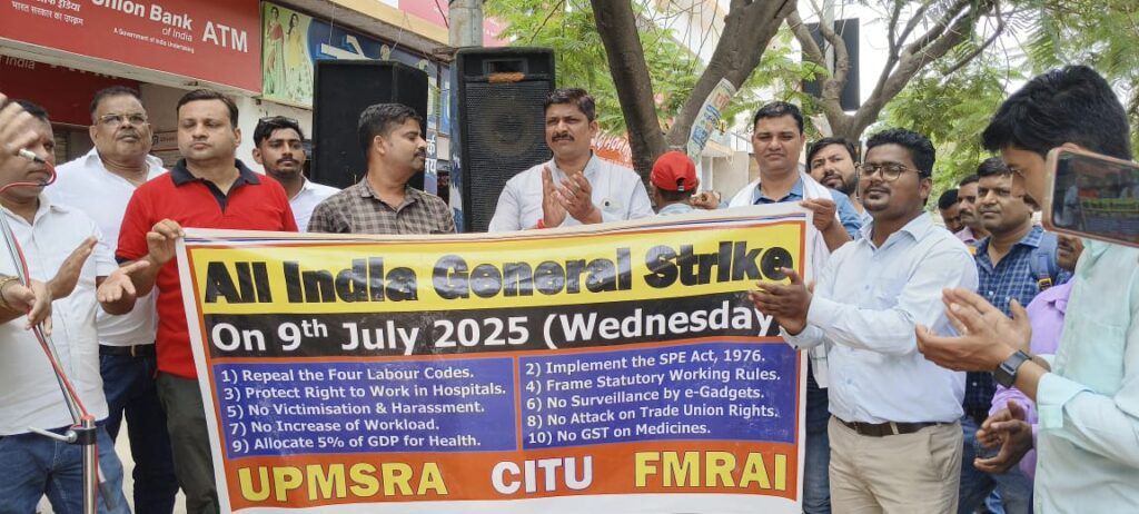 गाजीपुर। उत्तर प्रदेश उत्तराखंड मेडिकल एंड सेल्स रिप्रेंटेटिव एसोसिएशन UPMSRA व अपने राष्ट्रीय संगठन, फेडरेशन ऑफ मेडिकल रिप्रेंजेंटेटिव एसोसिएशन ऑफ इंडिया FMRAI के आवाह्न पर बुधवार को अखिल भारतीय हड़ताल के कार्यक्रमानुसार गाजीपुर ईकाई के सैकड़ों कार्यकर्ता एकदिवसीय हड़ताल पर रहे । लंका स्थित रामजानकी उद्यान में एकत्रित होकर सभा की । जिसमें जिलाध्यक्ष चंदन राय, जिलामंत्री मयंक श्रीवास्तव और राज्य कार्यकारिणी सदस्य अफजल ने हड़ताल की प्रासंगिकता पर प्रकाश डालते हुए सरकार और दवा कंपनी के नियोक्ताओं से अपनी मांगो को फिर से साथियों के बीच रखा। जिनमें केन्द्र सरकार से 44 श्रम कानूनो को चार लेबर कोड्स में बदलने के फैसले को वापस लेना, SPE(ACT) 1976 को लागू करने, काम की वैधानिक नियमावली तय, फिक्स टर्म इंप्लायमेंट को लागू नहीं करने जैसी मांगे शामिल हैं। तत्पश्चात सैकड़ों की संख्या में ईकाई के साथियों ने बाईक रैली निकाली जो लंका, विशेश्वरगंज, मिश्रबाजार होते हुए महुआबाग स्थित यूनियन बैंक की शाखा पर विभिन्न कर्मचारी संगठनों जिनमें AIBEU, CITU, AIAWU, कर्मचारी परिषद्, डाक विभाग जैसे संगठनों के हड़ताल में सम्मिलित हुए और वहां आयोजित सभा को पूर्ण समर्थन दिया।
