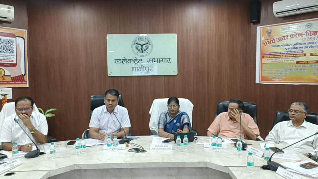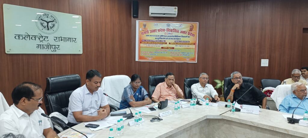 गाजीपुर । समर्थ उ0प्र0-विकसित उत्तर प्रदेश @ 2047 जन जागरूकता अभियान अन्तर्गत विभिन्न विभागों का प्रस्तुतिकरण एवं संवाद कार्यक्रम के दूसरे दिन कलेक्ट्रेट सभागार राईफल क्लब में दो सत्र में पूर्वान्ह 10.30 बजे से दोपहर 01 बजे तक एवं द्वितीय सत्र अपरान्ह 3.00 बजे से सायं 05 बजे तक आयोजित हुआ। इस संवाद/गोष्ठी कार्यक्रम का शुभारम्भ मुख्य अतिथियों/ प्रबुद्धजनों- बृज किशोर सिंह सेवानिवृत्त आईएएस, अखिलेश पाण्डेय सेवानिवृत्त आईएफएस, आर.के. राय सेवानिवृत्त आई आर एस, पारसनाथ प्रोफेसर बीएचयू, राजेन्द्र चन्द्र वर्मा कृषि वैज्ञानिक, नगर पालिका अध्यक्ष सरिता अग्रवाल, मुख्य विकास अधिकारी संतोष कुमार वैश्य ने दीप प्रज्जवलित कर किया। इस दौरान जनपद के नोडल अधिकारी/मण्डायुक्त वाराणसी मण्डल एस राज लिंगम भी मौजूद रहे। अतिथियों का स्वागत पुष्पगुच्छ, अंगवस्त्र व मोमेंटो देकर किया गया। कार्यक्रम के दौरान उत्तर प्रदेश @ 2047 के सम्बन्ध में एक लघु फिल्म का प्रदर्शन एल ई डी के माध्यम से दिखाया गया।