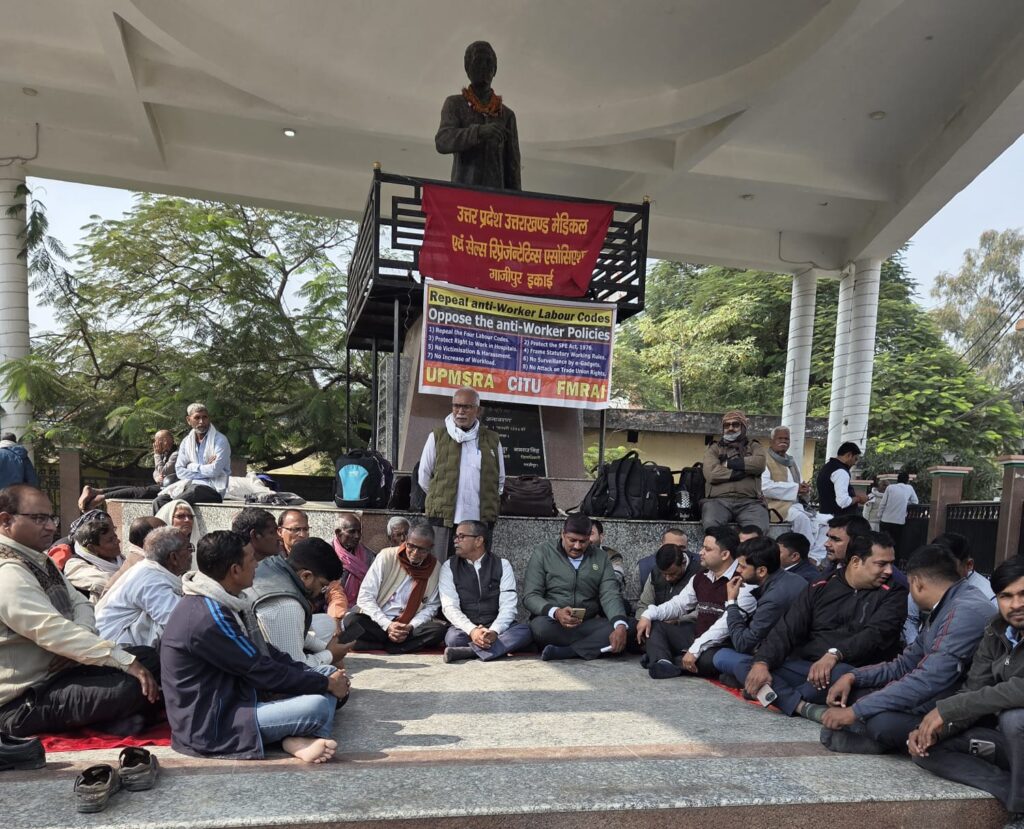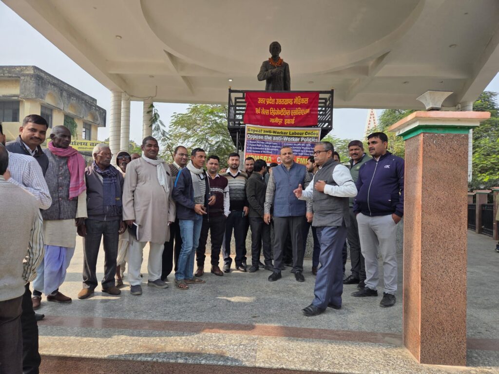गाजीपुर।केंद्र सरकार द्वारा मजदूरों/कर्मचारियों के अधिकारों और कार्य सुलभ 44 श्रम कानूनों को चार श्रम संहिताओं में बदलने और बीते 21 नवंबर को इसे लागू करने के मजदूर/कर्मचारी विरोधी निर्णय के विरोध में 26 नवंबर को तीसरे दिन यू पी एम एस आर ए की गाजीपुर ईकाई, अखिल भारतीय किसान सभा तथा citu के सदस्यों द्वारा सरजू पांडे पार्क में बांह पर काली पट्टी बांधकर धरना प्रदर्शन किया गया। अपनी असहमति जताते हुए इन चार श्रम संहिताओं के दुष्परिणामों पर गहन चर्चा कर केंद्र सरकार से इन संहिताओं को तत्काल वापस लेने की जोरदार मांग की गई। ए. के. जैन ने केंद्र सरकार की मजदूर/कर्मचारी विरोधी नीति और नियत पर सवाल उठाते हुए बताया की ये चार श्रम कोड कंपनी मालिकों को ठेका मजदूरी की खुली छूट के साथ बिना किसी कारण छंटनी और शोषण का अधिकार प्रदान करता है।जिसका तमाम ट्रेड संगठन लगातार तीन दिनों से विरोध कर रहे हैं। इसके अलावा अखिल भारतीय किसान सभा से योगेंद्र यादव ने किसानों एवं मजदूरों के विरूद्ध हो रहे तमाम प्रयासों की भर्त्सना की।उ. प्र. किसान सभा से ईश्वरी प्रसाद कुशवाहा केंद्र सरकार की आलोचना की और धरने को अपना समर्थन दिया, किसान सभा के मारकंडेय ने धरना को अपना समर्थन दिया। यू पी एम. एस. आर. ए. के प्रदेश संयुक्त महामंत्री आर. एम. राय ने मजदूरों, कर्मचारियों के विरूद्ध बन रही नीतियों और अधिकारों पर लगातार हमले पर प्रकाश डाला।