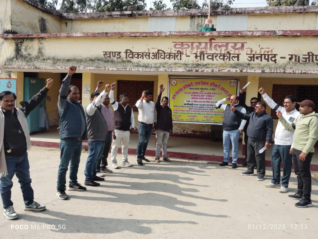 गाजीपुर। प्रांतीय नेतृत्व के आह्वान पर जनपद के समस्त सोलह विकास खंडों में ऑनलाइन उपस्थिति के विरोध में सचिवों ने काली पट्टी बांधकर शासकीय कार्य प्रारंभ किया। सत्याग्रह/ आंदोलन के बारे में विस्तृत जानकारी देते हुए समन्वय समिति के अध्यक्ष सूर्यभानु राय ने कहा कि सचिव से लक्ष्य आधारित कार्य लिया जाता है, छुट्टियों के दिन भी कार्य के लिए बुलाया जाता है तो फिर ऑनलाइन अटेंडेंस की बात बेमानी है। कार्यकारी अध्यक्ष बैजनाथ तिवारी ने कहा कि बिना संसाधन उपलब्ध कराए हुए पंचायत सचिवों की ऑनलाइन उपस्थिति दर्ज करने के लिए आदेश किया गया है जो पूर्णतः अव्यावहारिक है और कत्तई स्वीकार नहीं है। इसके विरोध में जनपद के समस्त विकास खंडों पर एकत्र होकर समस्त सचिवों ने काली पट्टी बांधकर ऑनलाइन उपस्थिति पर अपना विरोध दर्ज कराया एवं कहा कि उच्च अधिकारियों द्वारा सचिवों में भय का वातावरण पैदा कर जबरदस्ती अन्य विभागों के कार्य लिए जा रहे हैं। जिससे पंचायत और विकास विभाग का कार्य प्रभावित हो रहा है।सचिव संगठन अब किसी प्रकार का उत्पीड़न कत्तई बर्दाश्त नहीं करेगा। यदि शांतिपूर्ण सत्याग्रह/आंदोलन के बाद भी यह अव्यावहारिक आदेश वापस नहीं हुआ तो जनपद एवं प्रदेश के समस्त सचिव कार्य बहिष्कार के लिए बाध्य होंगे जिसकी संपूर्ण जिम्मेदारी शासन/ प्रशासन की होगी।